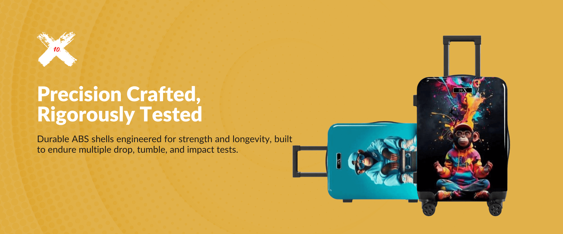 At 10X Bags, quality isn’t a checkbox — it’s our foundation. Every trolley bag we craft is built to meet and exceed global standards, undergoing rigorous testing to ensure it performs flawlessly in the real world.